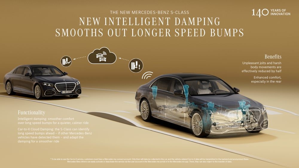 Predstavte si, že sa veziete v meste v režime kĺzania alebo jazdíte pokojnou rýchlosťou po kľukatých cestách nižšej triedy – každá jazda v novej Triede S sa vyznačuje príkladným tichom, kultivovaným komfortom a pokojom bez námahy. Umožňuje to vzduchové pruženie AIRMATIC, ktoré je súčasťou sériovej výbavy, alebo E-AKTÍVNE OVLÁDANIE POHYBU KAROSÉRIE (na želanie). Oba systémy sú teraz vybavené inteligentným tlmením, sofistikovanou inováciou, ktorá zvyšuje komfort elektrickým nastavením systému tlmenia tesne pred dlhýšmi úsekmi so spomaľovacími prahmi, bežnými najmä v južnej Európe a USA. Systém rozlišuje medzi krátkymi, ostrými nerovnosťami vozovky, ako sú výmole – ktoré sú rozpoznávané a komunikované ako výstrahy – a dlhšími úsekmi so spomaľovacími prahmi, ktoré vyvolávajú vertikálny pohyb karosérie, kde proaktívne nastavenie tlmenia môže merateľne zvýšiť komfort. Táto inteligentná regulácia tlmičov, ktorá je teraz k dispozícii aj pre systémy pruženia Triedy S, funguje v kombinácii so systémami AIRMATIC a E-AKTÍVNE OVLÁDANIE POHYBU KAROSÉRIE a využíva informácie z Komunikácie automobilu s okolím z iných vozidiel Mercedes-Benz prostredníctvom inteligentného cloudu Mercedes[24]. Mercedes-Benz už požiadal o patent tejto funkcie vyvinutej vo vlastnej réžii.