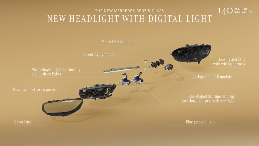 Nová éra prejavu a statusu: veľká osvetlená maska chladiča a nové svetlomety DIGITAL LIGHT ďalšej generácie s dizajnom dvojitých hviezd s inovatívnou technológiou mikroLED, ktorá poskytuje o cca 40 percent väčšiu osvetlenú oblasť s vysokým rozlíšením – to všetko spolu vytvára výraznú, nezameniteľnú svetelnú signatúru Triedy S.